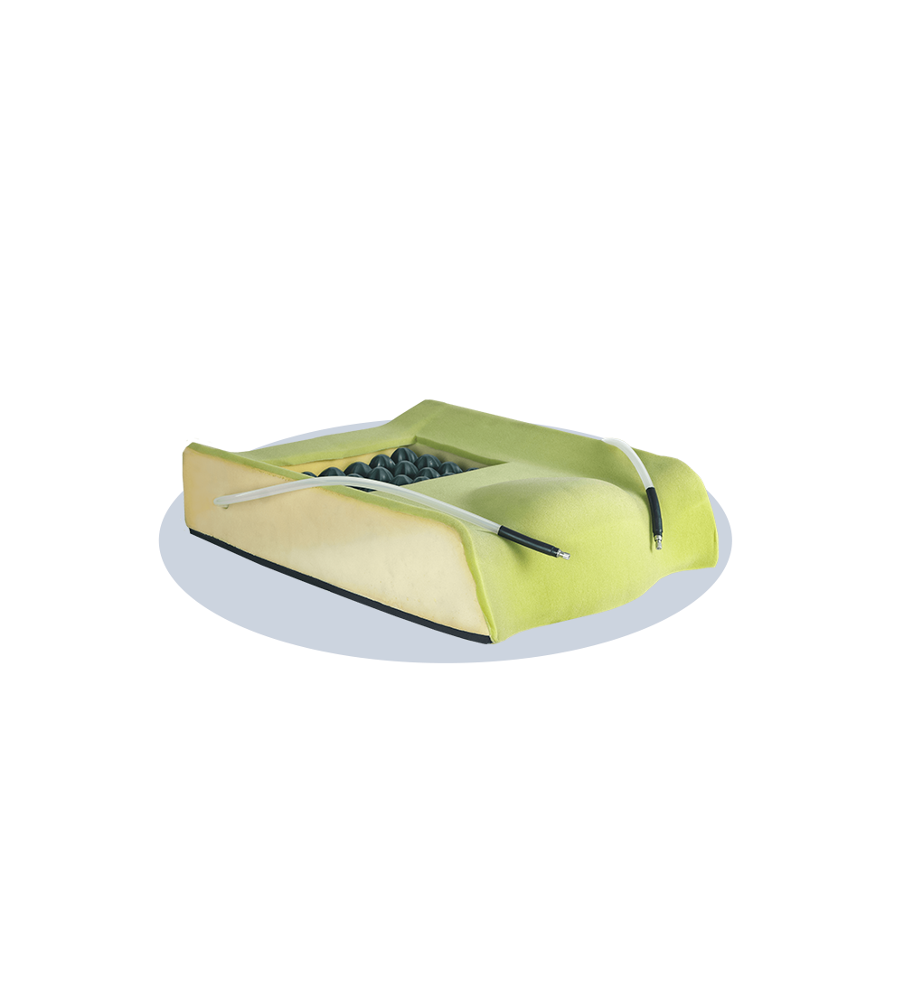 Inserto a bolle d’aria a 2 valvole, posizionato in zona ischiatico-coggigea, per lo scarico pressorio completo; indicato nei casi forte obliquità pelvica e rotazione del bacino.