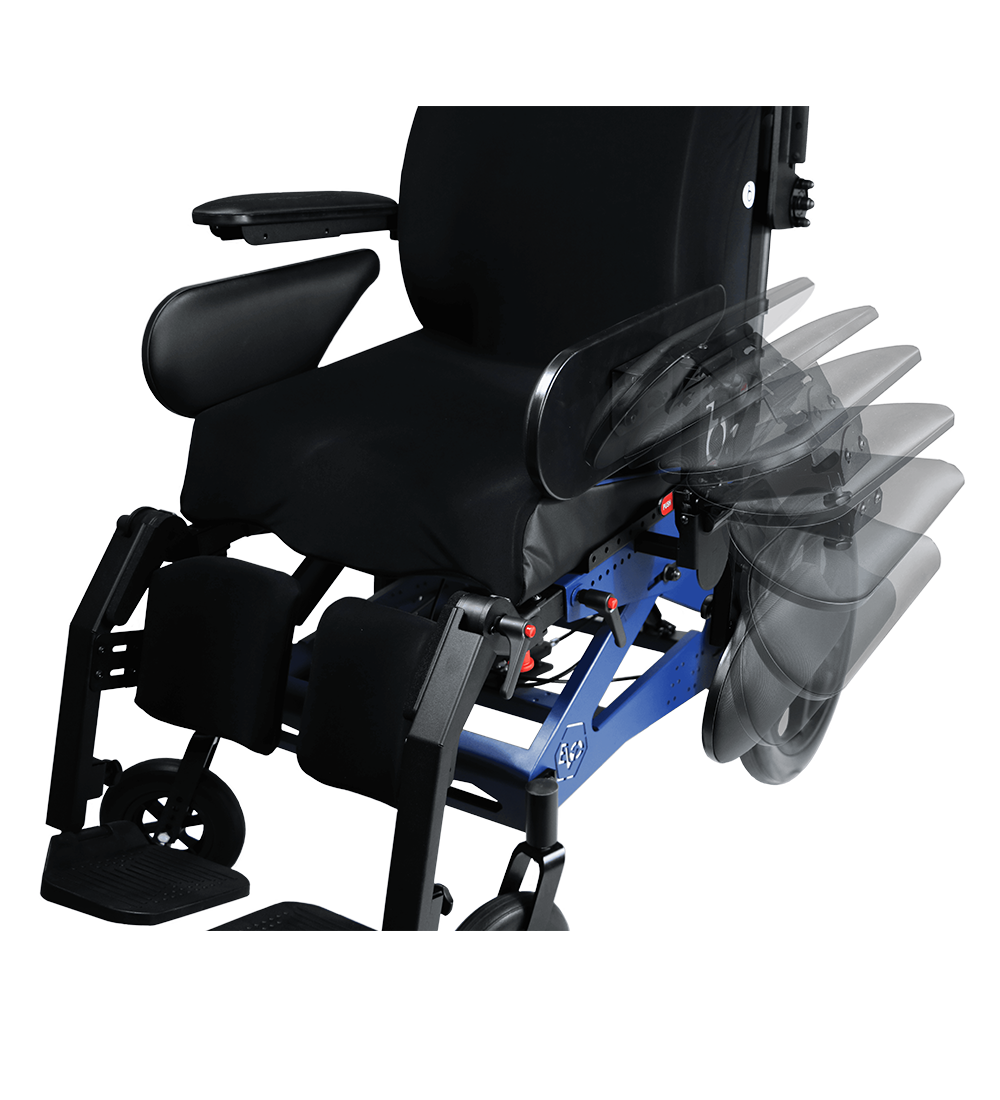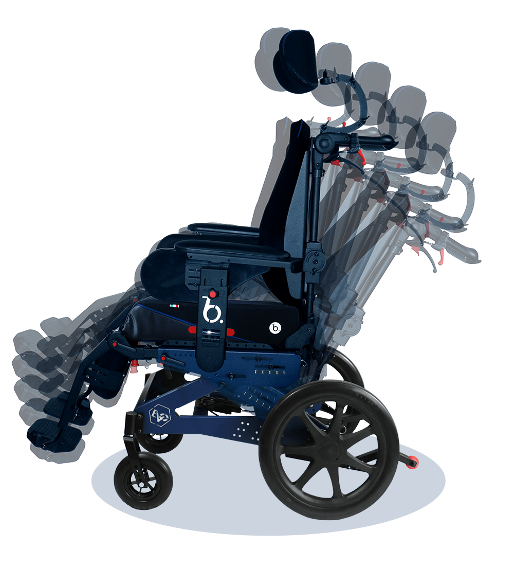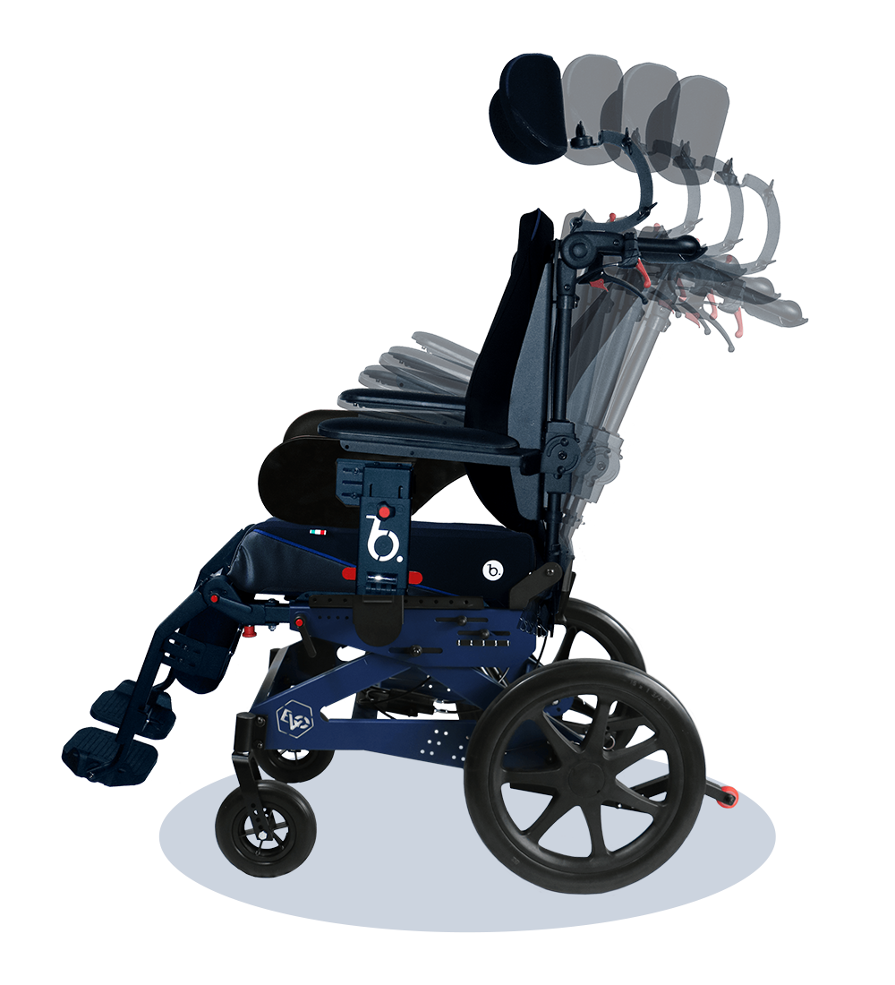 Adattabilità ai cambiamenti ponderali con la seduta regolabile in larghezza ed in profondità e lo schienale allargabile in continuo.